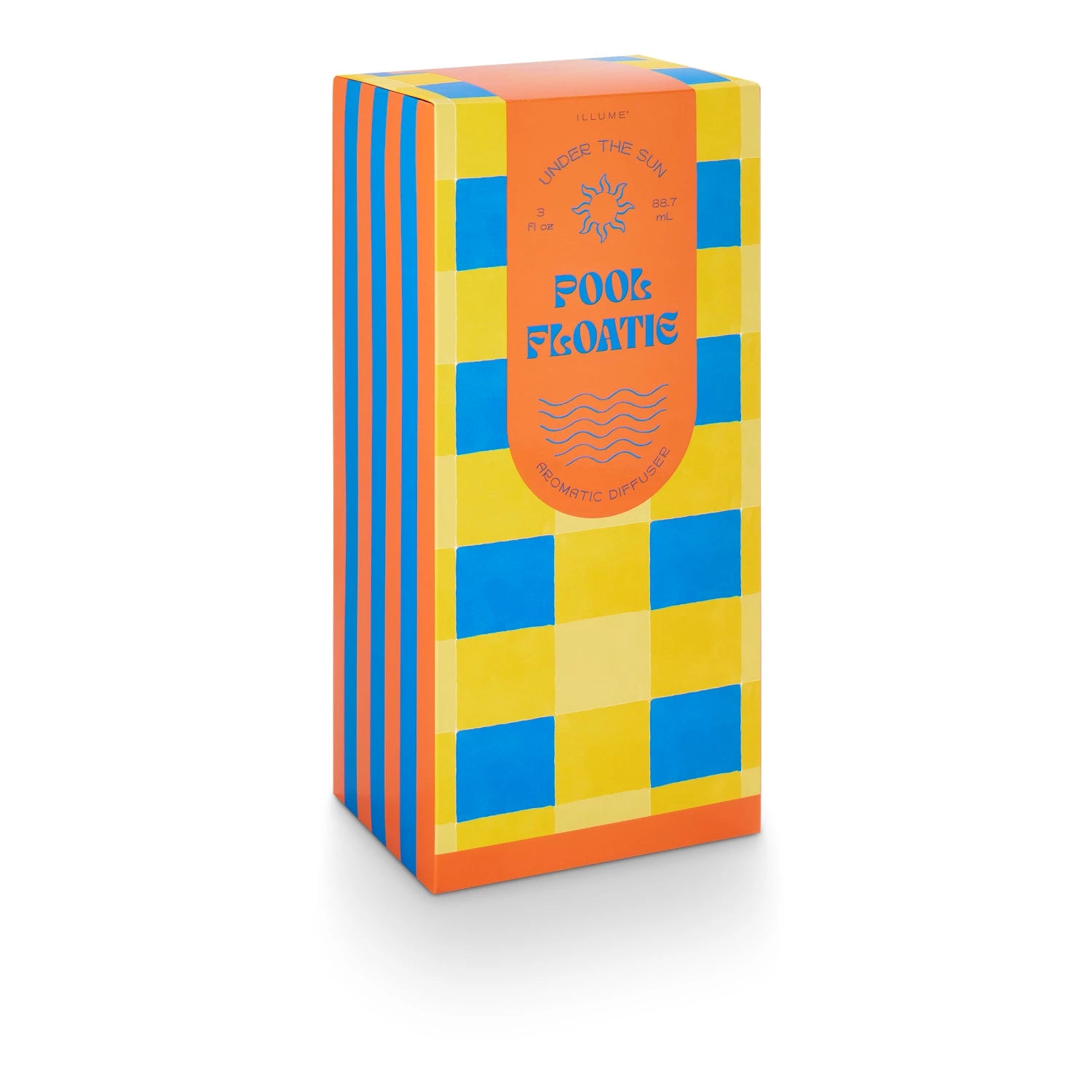 A translucent glass diffuser with a playful stacked bubble shape is tucked inside a pool towel inspired patterned box.